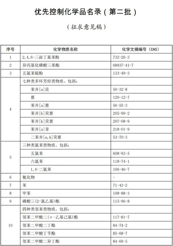 近日,生態(tài)環(huán)境部會同工業(yè)和信息化部、衛(wèi)生健康委組織編制了《優(yōu)先控制化學(xué)品名錄(第二批)(征求意見稿)》,公開征求意見,截止時(shí)間為2020年5月31日。《優(yōu)先控制化學(xué)品名錄(第二批)》重點(diǎn)關(guān)注環(huán)境和健康危害較大,環(huán)境中可能長期存在的,并可能對生態(tài)環(huán)境和人體健康存在不合理風(fēng)險(xiǎn)的化學(xué)物質(zhì)。第二批名錄包含19種類化學(xué)物質(zhì),涉及石化、塑料、橡膠、制藥、紡織、染料、皮革、電鍍、有色金屬冶煉、采礦等行業(yè)。這19類物質(zhì)是:2,4,6-三叔丁基苯酚、異丙基化磷酸三苯酯、五氯苯硫酚、苯并[a]芘等7種類多環(huán)芳烴類物質(zhì)、五氯苯等3種氯苯類物質(zhì)、氰化物、苯、甲苯、磷酸三(2-氯乙基)酯、鄰苯二甲酸二(α-乙基己基)酯等 4種鄰苯類物質(zhì)、1,2-二氯丙烷、1,1-二氯乙、2,4-二硝基甲苯、鄰甲苯胺、鉈及其化合物、多氯二苯并對二噁英和多氯二苯并呋喃、全氟辛酸及其鹽類和相關(guān)化合物、六氯丁二烯、五氯苯酚及其鹽類和酯類。