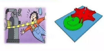 旋轉(zhuǎn)部件和固定部件的咬合處。如輻條手輪或飛輪和機床床身、喜歡轉(zhuǎn)攪拌機和無防護開口外殼攪拌裝置等。