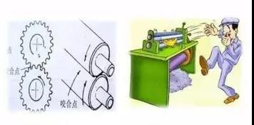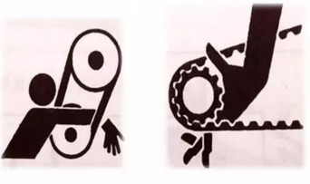 旋轉(zhuǎn)部件和成切線運動部件間的咬合處。如動力傳輸皮帶和皮帶輪、鏈條和鏈輪、齒條和齒輪等。