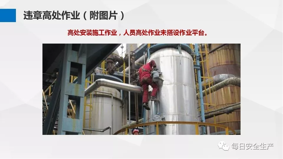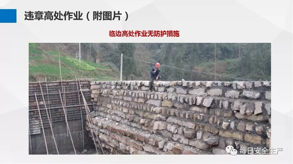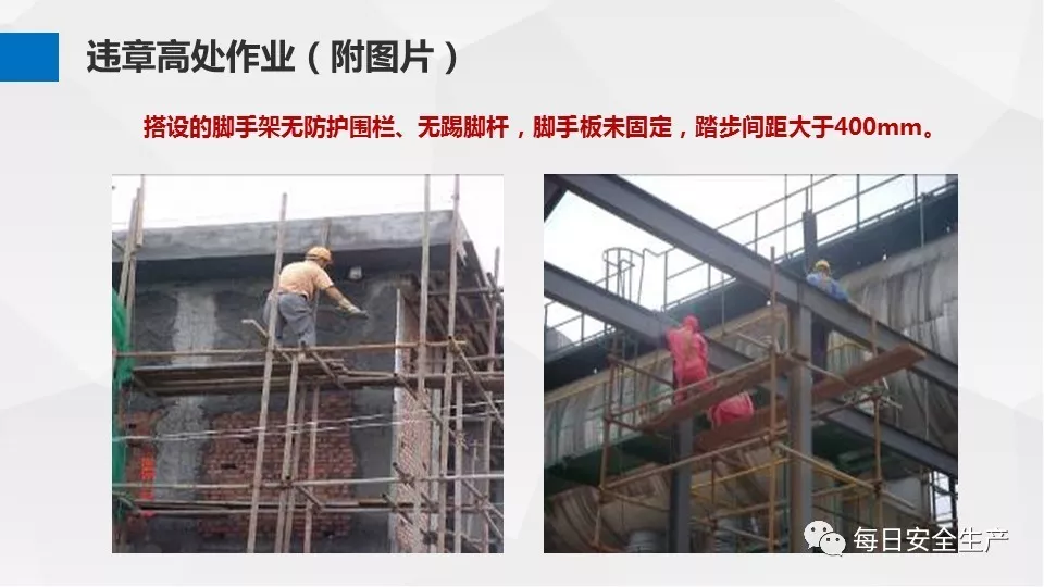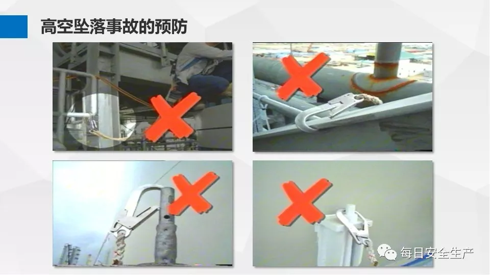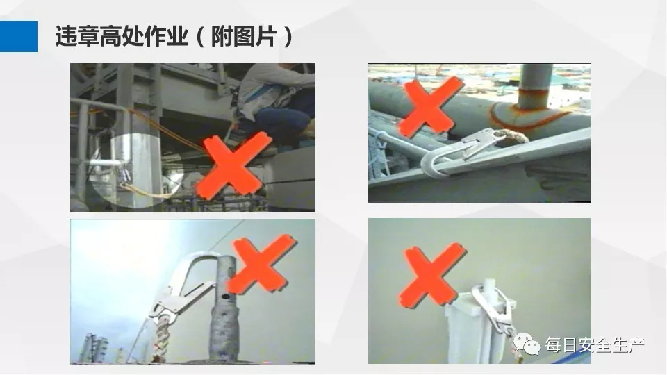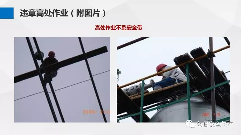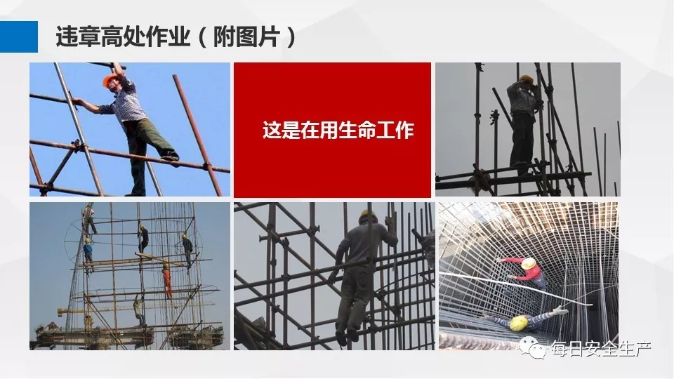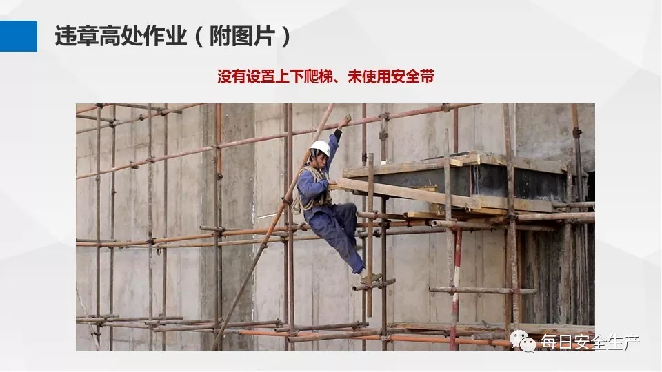 3、沒有戴安全帽、系安全帶,不扎緊褲管和無人監(jiān)護不登高。