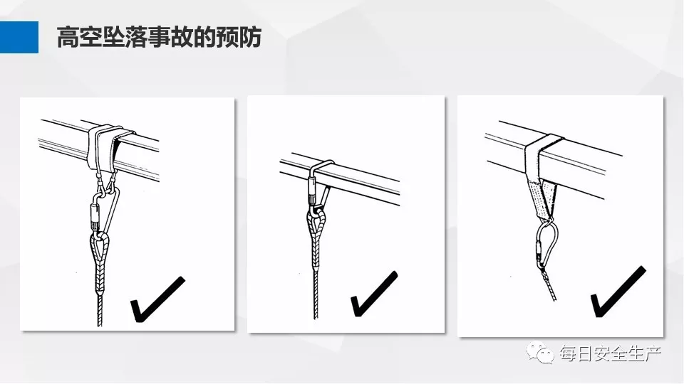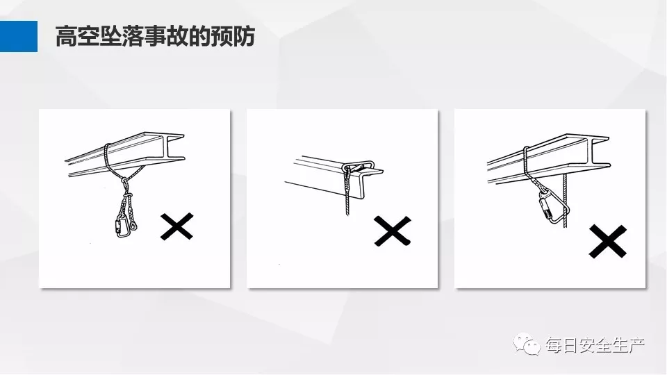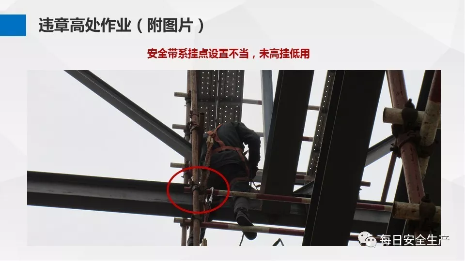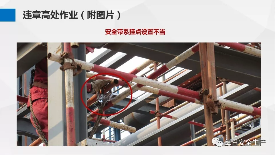 6、安全帶懸掛點不可靠,不牢固,如系掛在鋼結構下方,腳手架管邊緣等。