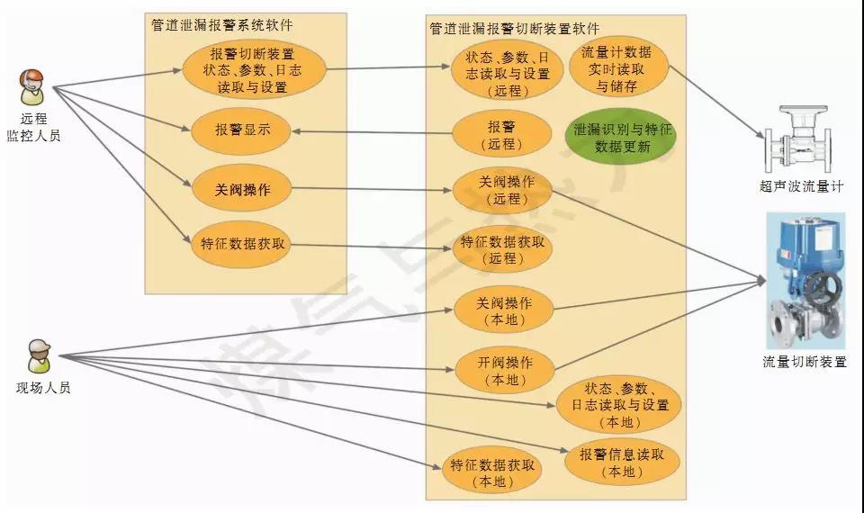 本系統(tǒng)選擇日本愛(ài)知AS超聲波流量計(jì),為速度式流量計(jì)。其使用壓力小于等于1.0 MPa,防爆防護(hù)等級(jí)為EX ib IIB T4 Gb IP65,數(shù)據(jù)通信協(xié)議為RS485 MODBUS/RTU,精度等級(jí)為1.0級(jí)。超聲波流量計(jì)相較于其他類(lèi)型流量計(jì)(如渦輪流量計(jì)),由于無(wú)轉(zhuǎn)動(dòng)組件,不受慣性影響,對(duì)瞬時(shí)流量變化的靈敏度更高,且流量范圍較廣,始動(dòng)流量較小,例如DN 50 mm口徑的超聲波流量計(jì)始動(dòng)流量為0.37 m3/h,DN 100 mm口徑的超聲波流量計(jì)始動(dòng)流量為1.25 m3/h。對(duì)小流量感知更靈敏,用于管網(wǎng)瞬時(shí)流量的監(jiān)測(cè)與捕捉,比較適合[5]。本系統(tǒng)選擇的遠(yuǎn)傳裝置為山東思達(dá)特ST2000模塊,其負(fù)責(zé)太陽(yáng)能電池系統(tǒng)供電管理和與燃?xì)夤镜谋O(jiān)測(cè)平臺(tái)系統(tǒng)遠(yuǎn)程通信。遠(yuǎn)傳裝置采用RS485直讀方式從數(shù)據(jù)采集分析裝置獲取數(shù)據(jù),通過(guò)GPRS/CDMA無(wú)線通信進(jìn)行遠(yuǎn)傳,發(fā)送流量數(shù)據(jù)與報(bào)警信息,接收監(jiān)測(cè)平臺(tái)系統(tǒng)的指令,并下達(dá)到數(shù)據(jù)采集分析裝置。數(shù)據(jù)采集分析裝置與流量計(jì)、遠(yuǎn)傳裝置、太陽(yáng)能電池系統(tǒng)等連接。超聲波流量計(jì)自帶電池可單獨(dú)運(yùn)行。整套供電系統(tǒng)可以正常運(yùn)行6 a以上。 為實(shí)現(xiàn)流量監(jiān)測(cè)、泄漏識(shí)別、報(bào)警遠(yuǎn)傳、遠(yuǎn)程切斷等功能,系統(tǒng)軟件主要由本地管道泄漏報(bào)警切斷裝置軟件和遠(yuǎn)端管道泄漏報(bào)警系統(tǒng)軟件兩部分組成。系統(tǒng)用例圖(軟件開(kāi)發(fā)用于系統(tǒng)業(yè)務(wù)功能需求分析、系統(tǒng)建模的示意圖)見(jiàn)圖3,參與者包括:管道泄漏報(bào)警切斷裝置軟件、超聲波流量計(jì)、流量切斷裝置、管道泄漏報(bào)警系統(tǒng)軟件、遠(yuǎn)程監(jiān)控人員、現(xiàn)場(chǎng)人員。其中,管道泄漏報(bào)警系統(tǒng)可以是其他的SCADA平臺(tái)系統(tǒng),這里只是為完成遠(yuǎn)程泄漏監(jiān)測(cè)、報(bào)警、遠(yuǎn)程切斷、參數(shù)設(shè)置等功能,所列舉的功能模塊。本文主要探討本地管道泄漏報(bào)警切斷裝置軟件的設(shè)計(jì),即數(shù)據(jù)采集分析裝置主板的內(nèi)置程序,配合遠(yuǎn)傳裝置實(shí)現(xiàn)相關(guān)功能。由圖3可知,管道泄漏報(bào)警切斷裝置軟件設(shè)計(jì)包括泄漏識(shí)別與特征數(shù)據(jù)更新,流量計(jì)數(shù)據(jù)實(shí)時(shí)讀取與儲(chǔ)存,狀態(tài)、參數(shù)、日志讀取與設(shè)置(遠(yuǎn)程發(fā)送與本地操作),報(bào)警(遠(yuǎn)程發(fā)送),關(guān)閥操作(遠(yuǎn)程操作),特征數(shù)據(jù)獲?。ㄟh(yuǎn)程發(fā)送與本地操作),報(bào)警信息讀?。ū镜夭僮鳎?,開(kāi)關(guān)閥操作(本地操作)等程序功能組成。遠(yuǎn)程監(jiān)控人員通過(guò)SCADA系統(tǒng)進(jìn)行遠(yuǎn)程交互操作?,F(xiàn)場(chǎng)人員通過(guò)數(shù)據(jù)采集分析裝置按鍵、顯示屏、SD卡進(jìn)行本地交互操作[6]。