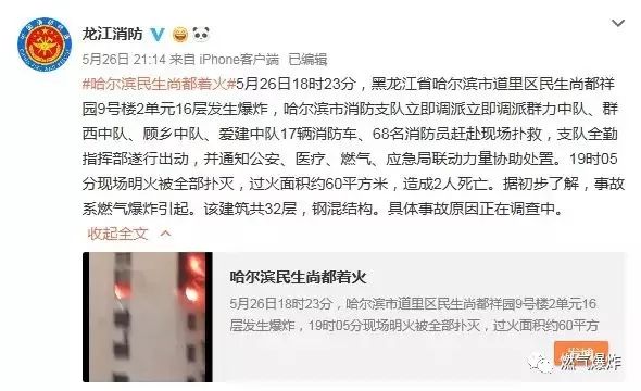 據(jù)@龍江消防:#哈爾濱民生尚都著火#5月26日18時23分,黑龍江省哈爾濱市道里區(qū)民生尚都祥園9號樓2單元16層發(fā)生爆炸,哈爾濱市消防支隊立即調派立即調派群力中隊、群西中隊、顧鄉(xiāng)中隊、愛建中隊17輛消防車、68名消防員趕赴現(xiàn)場撲救,支隊全勤指揮部遂行出動,并通知公安、醫(yī)療、燃氣、應急局聯(lián)動力量協(xié)助處置。19時05分現(xiàn)場明火被全部撲滅,過火面積約60平方米,造成2人死亡。據(jù)初步了解,事故系燃氣爆炸引起。該建筑共32層,鋼混結構。
