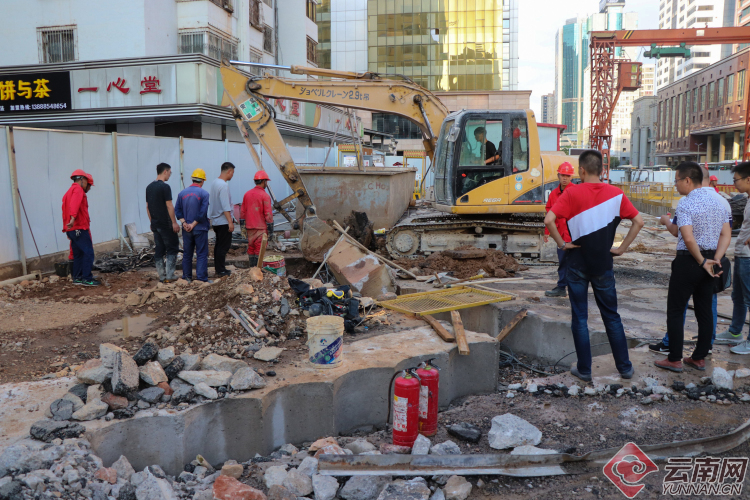 記者在現(xiàn)場看到,中鐵十八局、燃?xì)夤?、消防單位、交警單位、軌道公司等工作人員正在事發(fā)區(qū)域進(jìn)行搶修,一輛消防車??吭谑┕鷵鯄ν猓惠v標(biāo)有昆明煤氣的搶修車輛及兩輛標(biāo)有云南中石油昆侖燃?xì)獾娜細(xì)鈸岆U車輛停在施工區(qū)域內(nèi),另有一臺挖掘機(jī)正在作業(yè),一旁的交通信號燈已經(jīng)熄滅,交警在交叉口指揮疏導(dǎo)通行車輛。