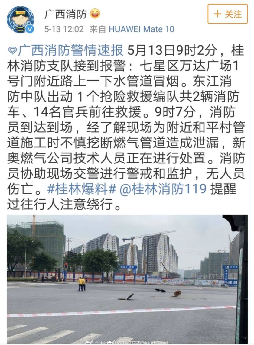中午12時,@廣西消防官微發(fā)布了一警情速報:5月13日9時2分,桂林消防支隊接到報警:七星區(qū)萬達廣場1號門附近路上一下水管道冒煙。9時7分,消防員到達到場,經了解現(xiàn)場為附近和平村管道施工時不慎挖斷燃氣管道造成泄漏,新奧燃氣公司技術人員正在進行處置。消防員協(xié)助現(xiàn)場交警進行警戒和監(jiān)護,無人員傷亡。