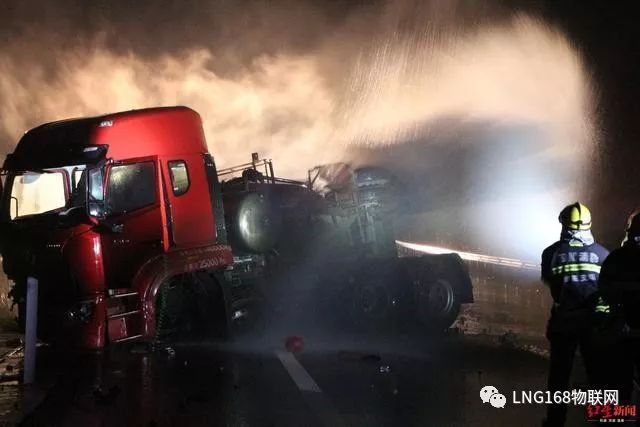 消防救援人員介紹,由于事故車輛為L(zhǎng)NG(液化天然氣)動(dòng)力,事故導(dǎo)致LNG氣罐閥門變形泄漏,且LNG儲(chǔ)存罐處于滿載狀態(tài),如發(fā)生爆炸燃燒后果不堪設(shè)想。根據(jù)現(xiàn)場(chǎng)情況,救援人員決定采取放空稀釋的方法進(jìn)行處置。隨后,救援行動(dòng)展開(kāi),一是高速交警立即對(duì)該路段進(jìn)行封鎖,實(shí)施現(xiàn)場(chǎng)警戒;二是消防救援人員利用開(kāi)花水槍、泡沫槍分別對(duì)氣罐泄漏點(diǎn)及周邊進(jìn)行稀釋覆蓋,防止發(fā)生次生災(zāi)害。同時(shí),救援人員調(diào)集大型吊車和裝載車對(duì)事故車輛進(jìn)行起吊拖離。
