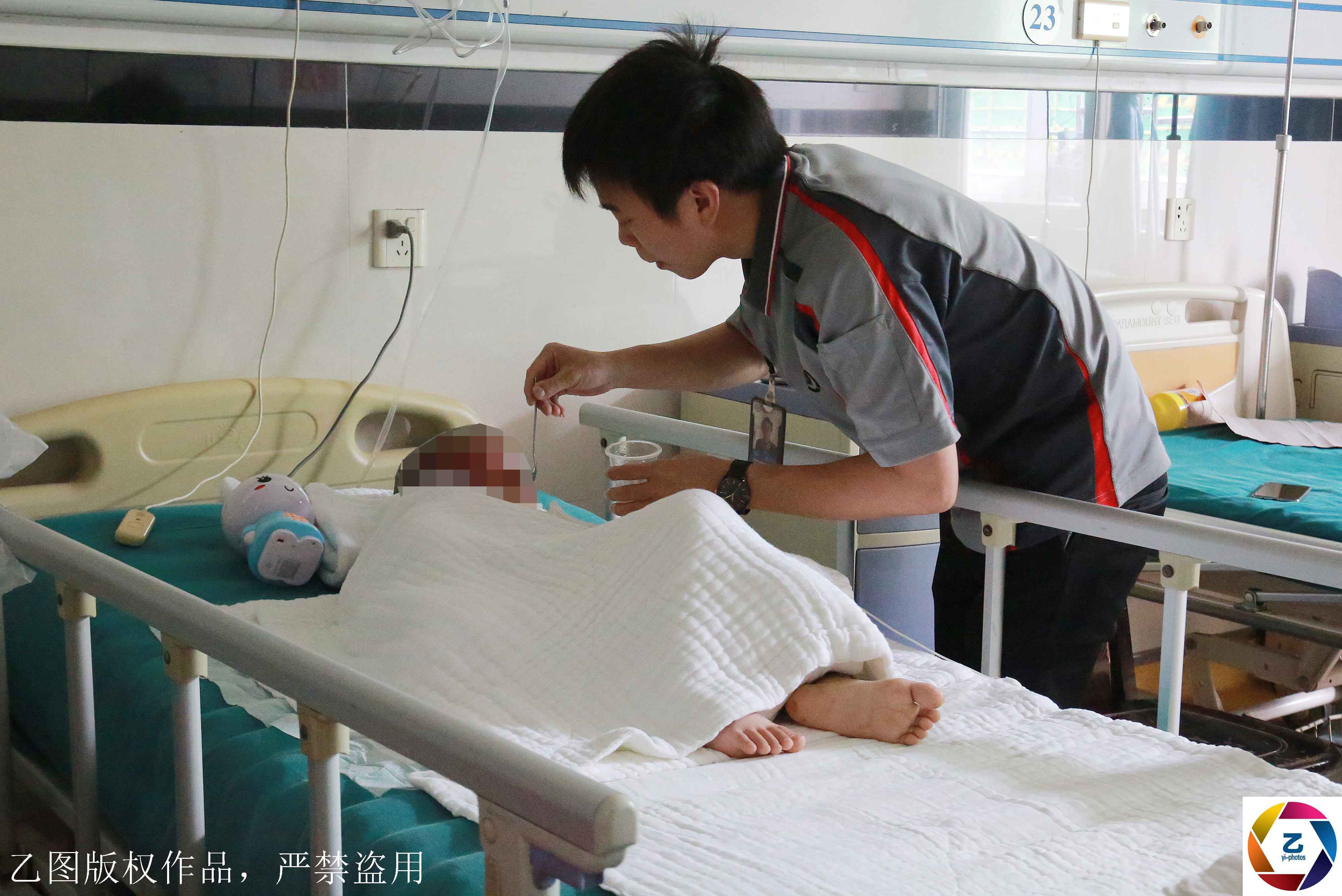 經(jīng)過搶救,小俊逸幸運活了下來。據(jù)悉,小俊逸在爆炸中重度燒傷,深二度達9%,深三度達40%。醫(yī)生說孩子的雙手無法保住,但是馬上截肢孩子會有生命危險,需要先治療一段時間后再做手術(shù)。清醒之后的小俊逸不時痛苦地呻吟,他還不知道,爸爸和哥哥已經(jīng)永遠離開了他。圖為護工在照顧躺在病床上的小俊逸。
