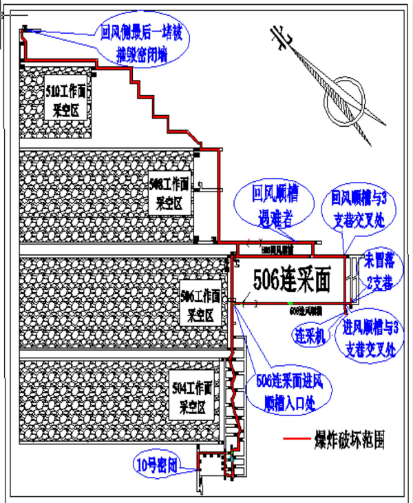 1. 爆炸沖擊波及全礦井,主要破壞范圍為506連采面和506連采面進、回風(fēng)巷道(如圖3)。