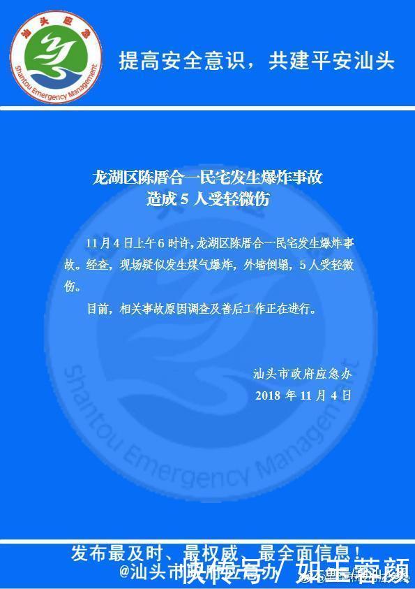 據(jù)“汕頭市政府應(yīng)急辦”發(fā)布通報(bào)稱:2018年11月4日上午6時(shí)許,汕頭龍湖區(qū)陳厝合一民宅發(fā)生爆炸事故。經(jīng)查,現(xiàn)場(chǎng)疑似發(fā)生煤氣爆炸,外墻倒塌,5人受輕微傷。目前,相關(guān)事故原因調(diào)查及善后工作正在進(jìn)行。