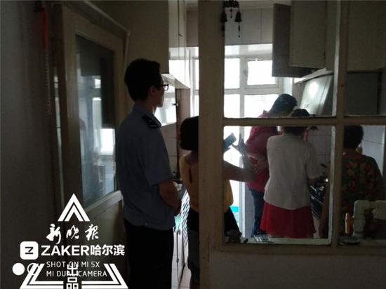 圖為事發(fā)現場 7 月 23 日 10 時 30 分許,斯大林派出所民警接到市民報警稱,在道里區(qū)尚志胡同 25 號 5 單元 4 樓的居民家中,有煤氣泄漏,十分危險,民警賈野等人立即出警。在現場,燃氣公司的工作人員說,煤氣泄漏已經達到爆炸標準,需要立刻疏散居民。