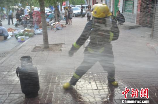 雖然水槍朝著液化氣罐持續(xù)射水,但已被燒成漆黑的罐體仍舊很燙。為了讓氣罐遠(yuǎn)離明火,劉愛(ài)文拎起氣罐將其轉(zhuǎn)移至室外安全地帶。在拎著氣罐向室外狂奔的過(guò)程中,水槍一刻未曾離開(kāi)他和他手中的氣罐,最大限度確保其安全。